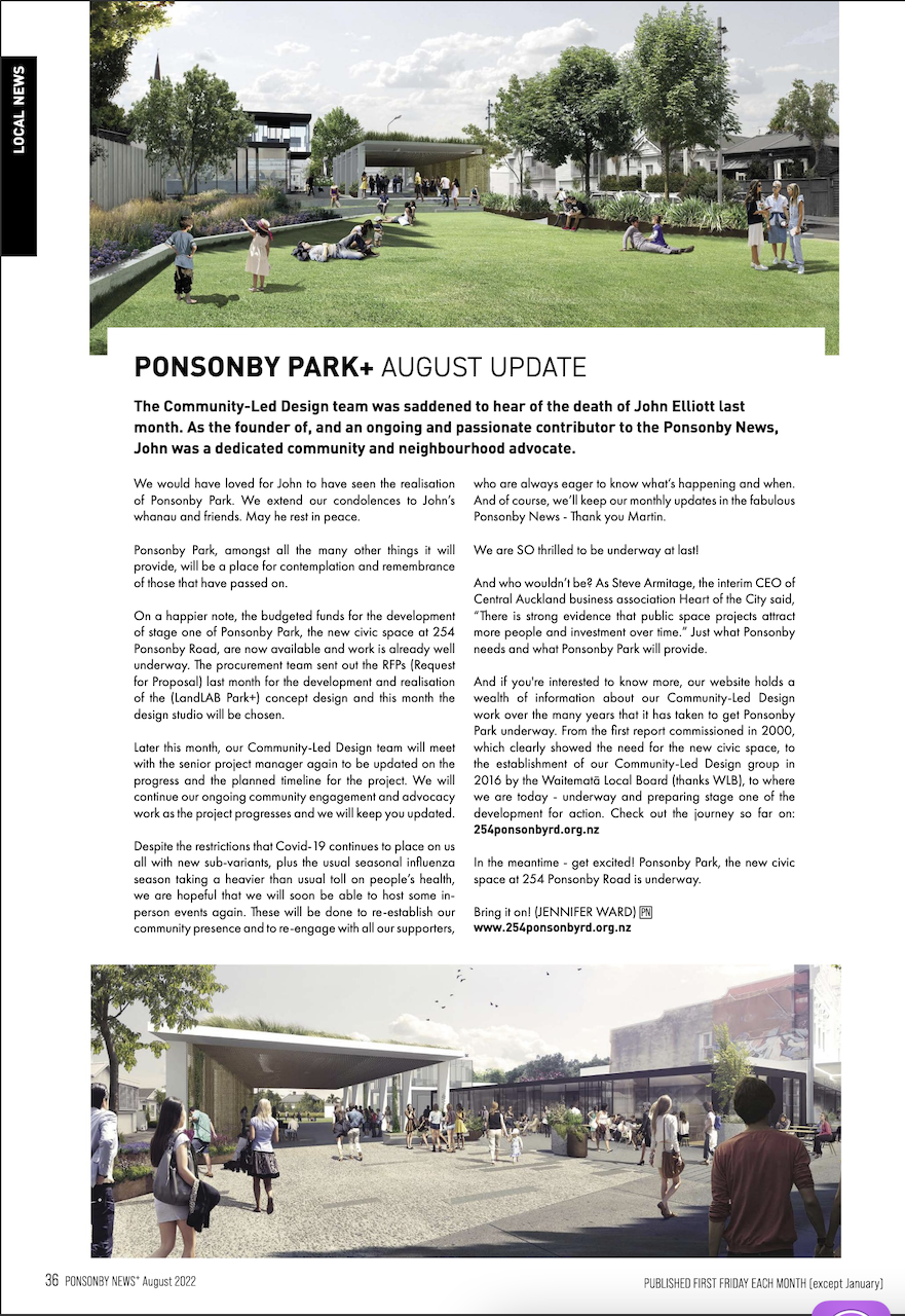 On a happier note, the budgeted funds for the development of stage one of Ponsonby Park, the new civic space at 254 Ponsonby Road, are now available and work is already well underway. The procurement team sent out the RFPs (Request for Proposal) last month for the development and realisation of the (LandLAB Park+) concept design and this month the design studio will be chosen.