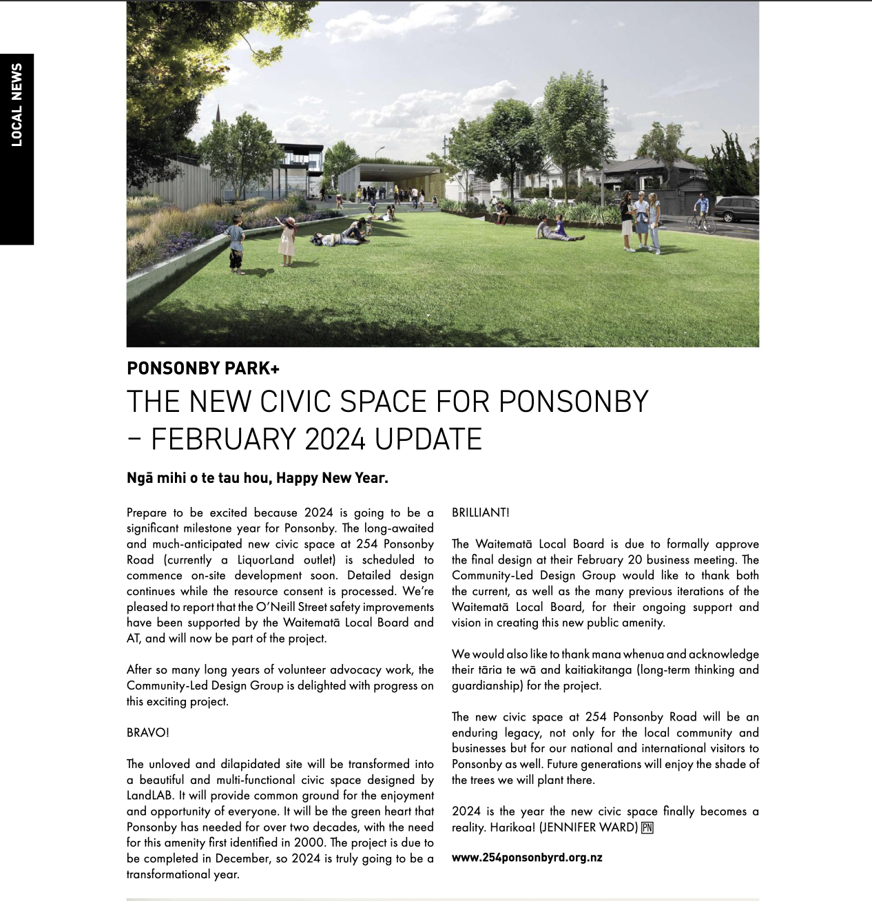 The unloved and dilapidated site will be transformed into a beautiful and multi-functional civic space designed by LandLAB. It will provide common ground for the enjoyment and opportunity of everyone. It will be the green heart that Ponsonby has needed for over two decades, with the need for this amenity first identified in 2000. The project is due to be completed in December, so 2024 is truly going to be a transformational year.