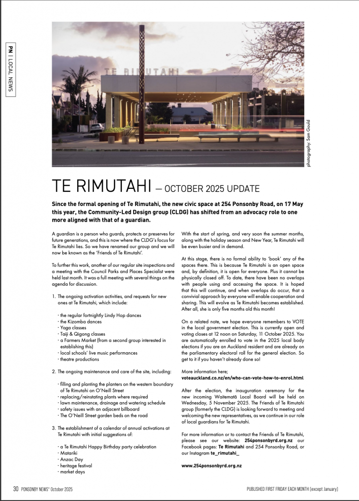 Since the formal opening of Te Rimutahi, the new civic space at 254 Ponsonby Road, on May 17 this year, the Community-Led Design group (CLDG) has shifted from an advocacy role to one more aligned with that of a guardian.