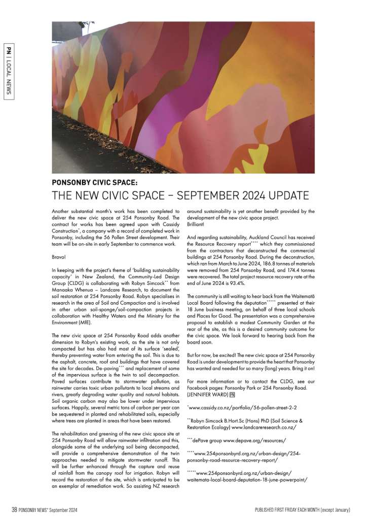 The rehabilitation and greening of the new civic space site at 254 Ponsonby Road will allow rainwater infiltration and this, alongside some of the underlying soil being de-compacted, will provide a comprehensive demonstration of the twin approaches needed to mitigate stormwater runoff. This will be further enhanced through the capture and reuse of rainfall from the canopy roof for irrigation. Robyn will record the restoration of the site, which is anticipated to be an exemplar of remediation work. So assisting NZ research around sustainability is yet another benefit provided by the development of the new civic space project. Brilliant!