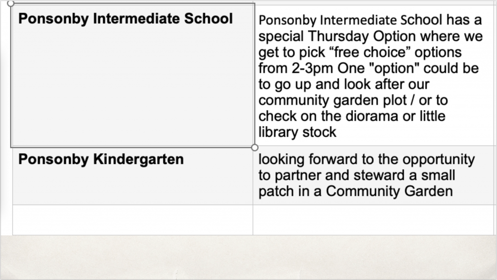 Slide 3 – Community Garden planning is underway with 3 x schools. Tamariki have actively exhibited their aspiration for a community garden – as outlined in the ‘Schools Report’ released by the Project Manager – Bill Jackson.