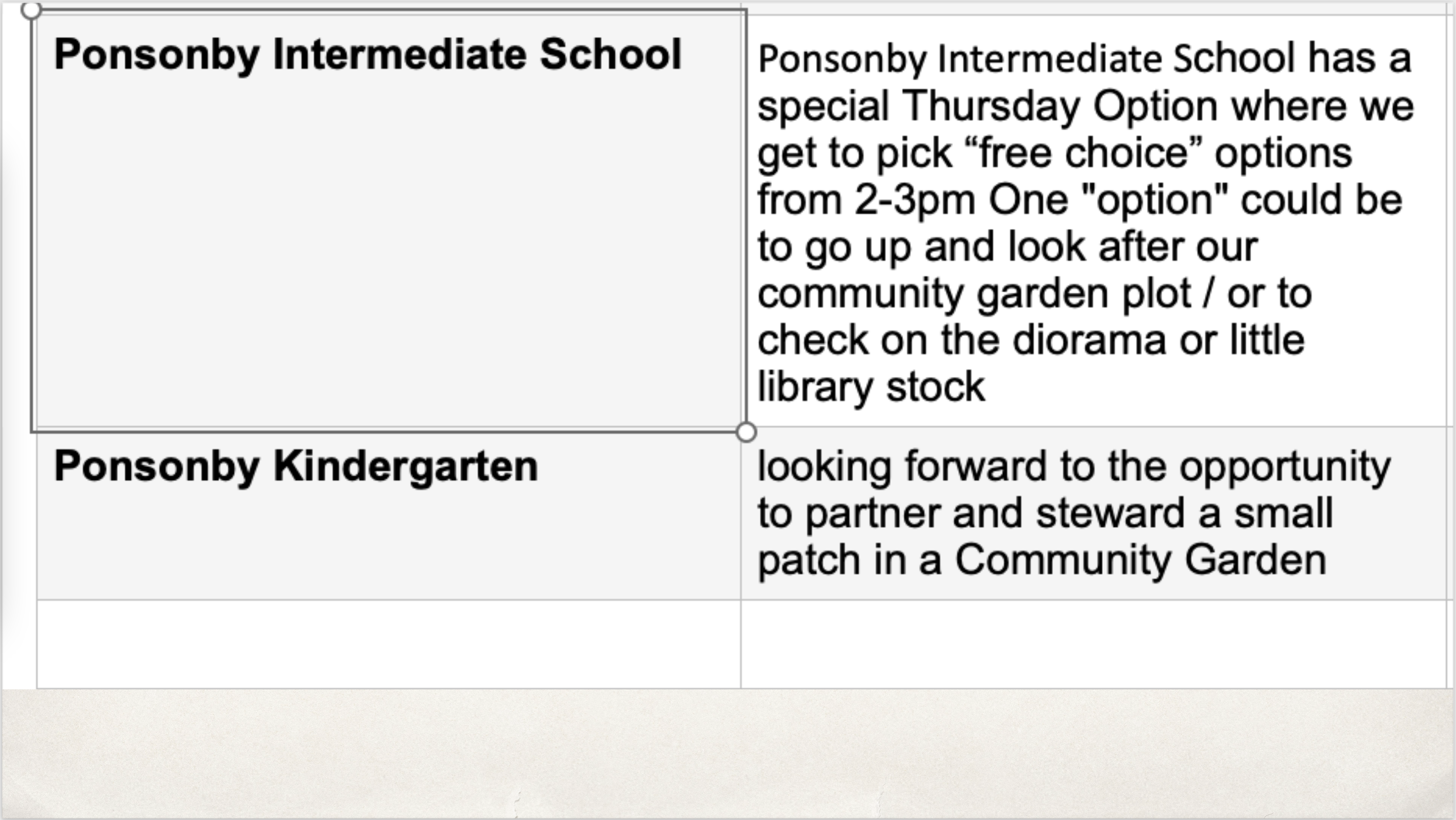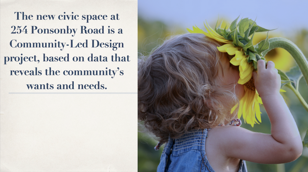 Slide 33 – Members of the community & tamariki from three local schools have shown their desire for a community garden at the new civic space at 254 Ponsonby Road.