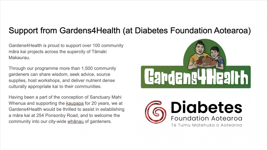 …we at Gardens4Health would be thrilled to assist in establishing a māra kai at 254 Ponsonby Road and to welcome the community into our city-wide whānau of gardeners.