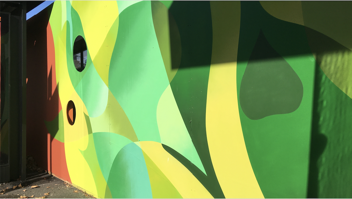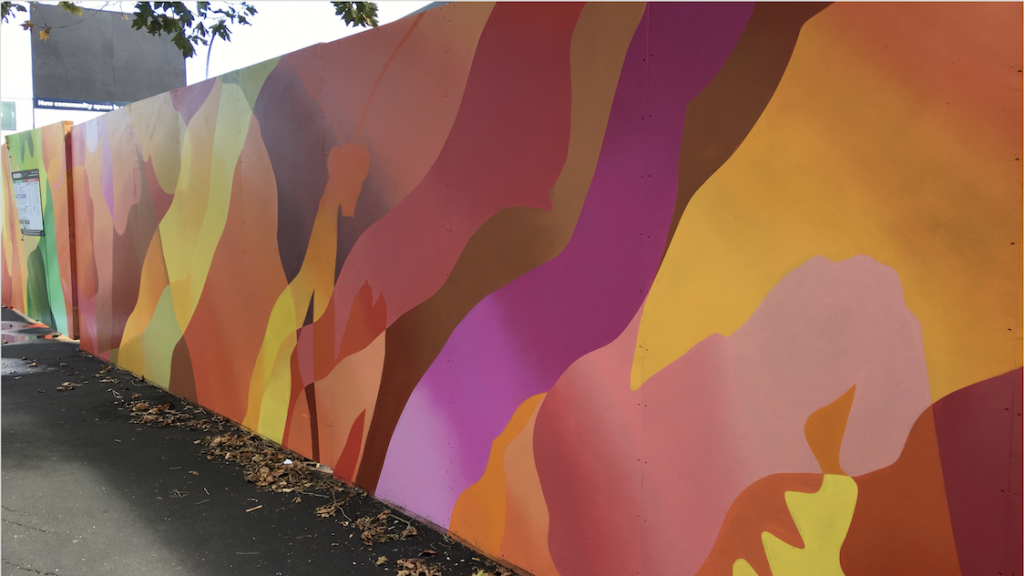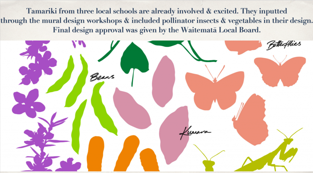 Slide 7 – Tamariki from three local schools have inputted their ideas through design workshops, for the mural on the hoardings on-site at 254, facilitated by Places for Good. It was they, the students, who chose to include the pollinator insects and vegetables.