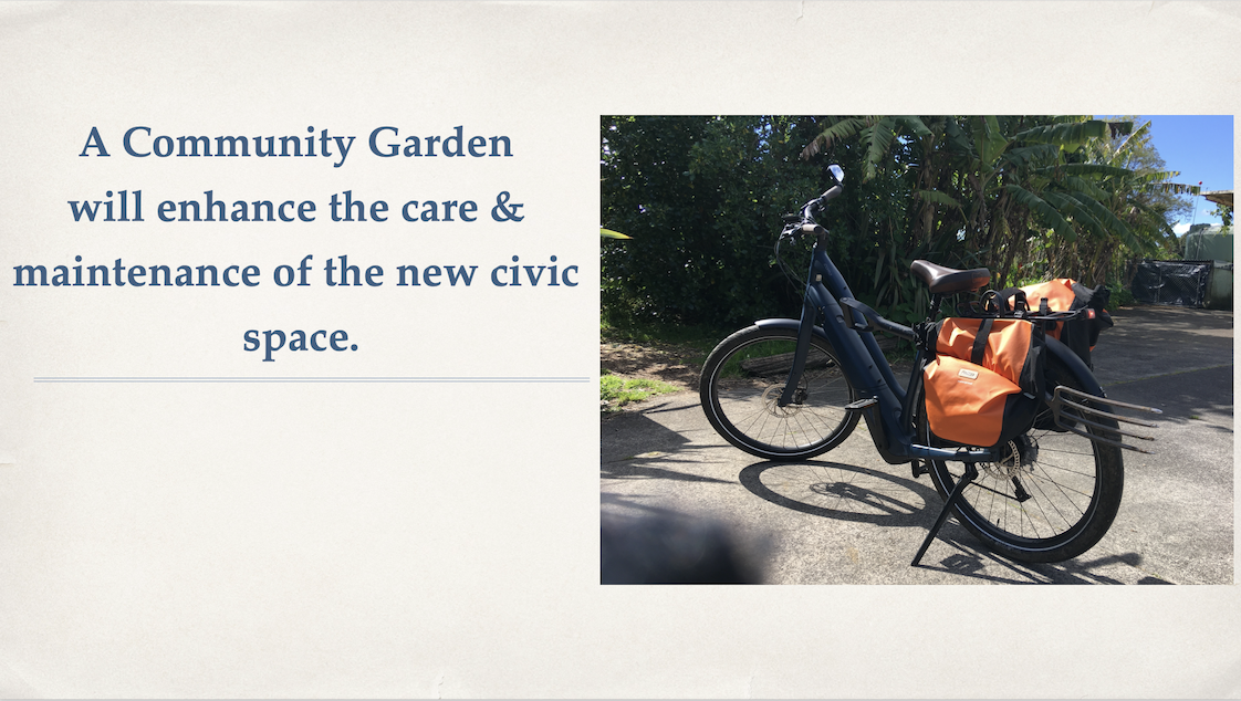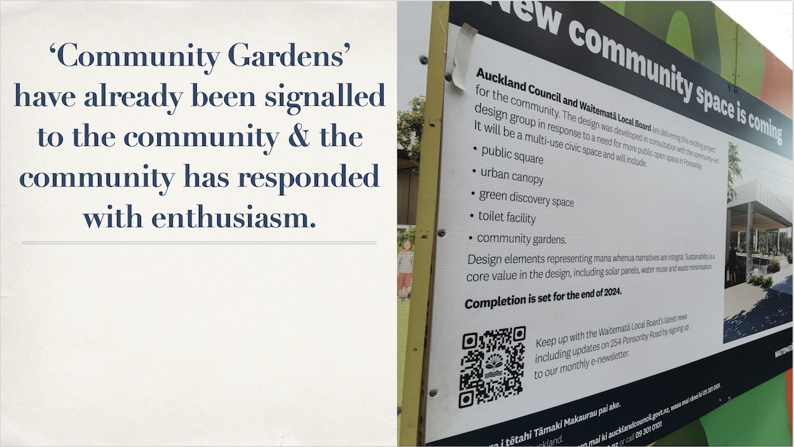 We have seen the desire for what for us would be a ’satellite’ community garden at the new civic space in Ponsonby. It would form part of a network of gardens providing nutritious, community-based food, throughout our local neighbourhoods and the whenua.
