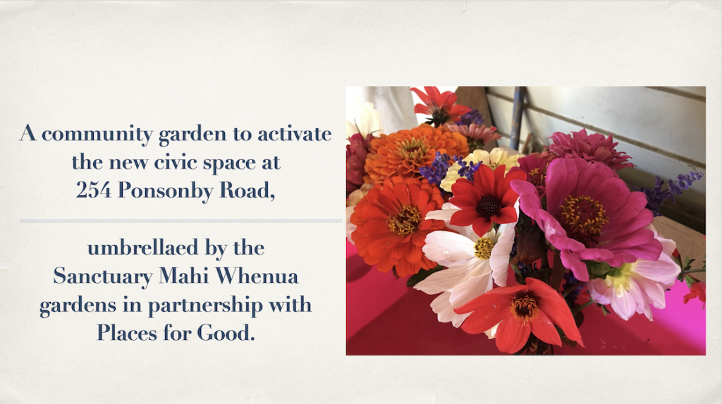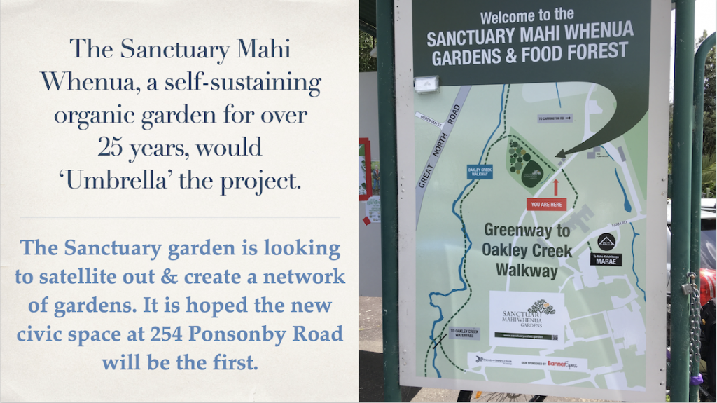 Slide 6 – We propose that the Sanctuary Mahi Whenua would umbrella the new community garden at 254 Ponsonby Road, in partnership with Places for Good.