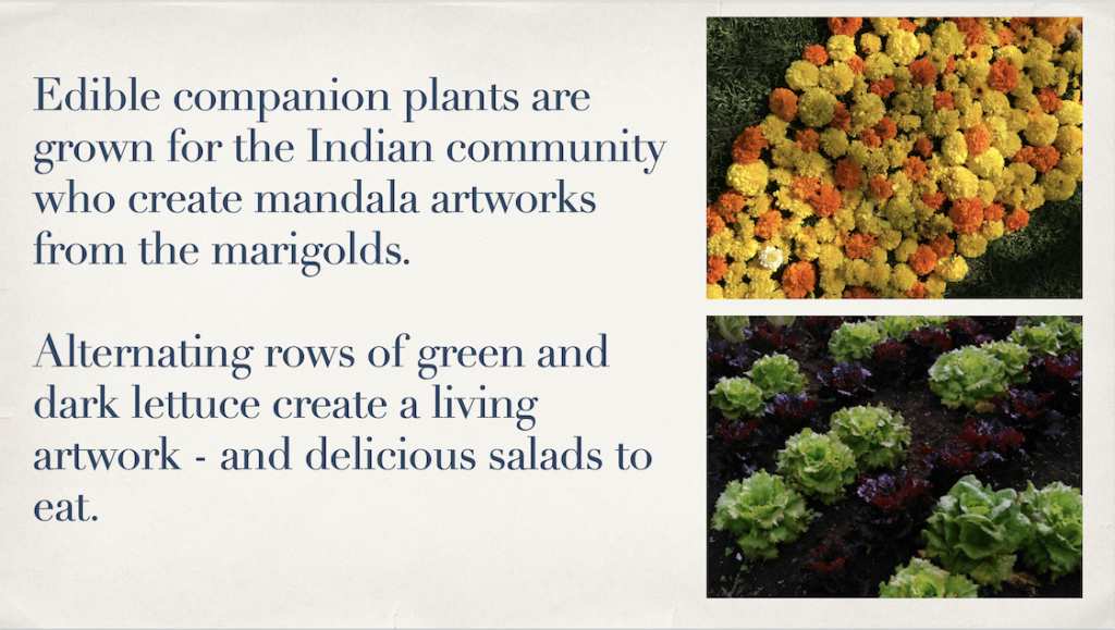 Slide 19 – We grow edible companion plants for the Indian community who create mandala artworks from the marigolds each year.