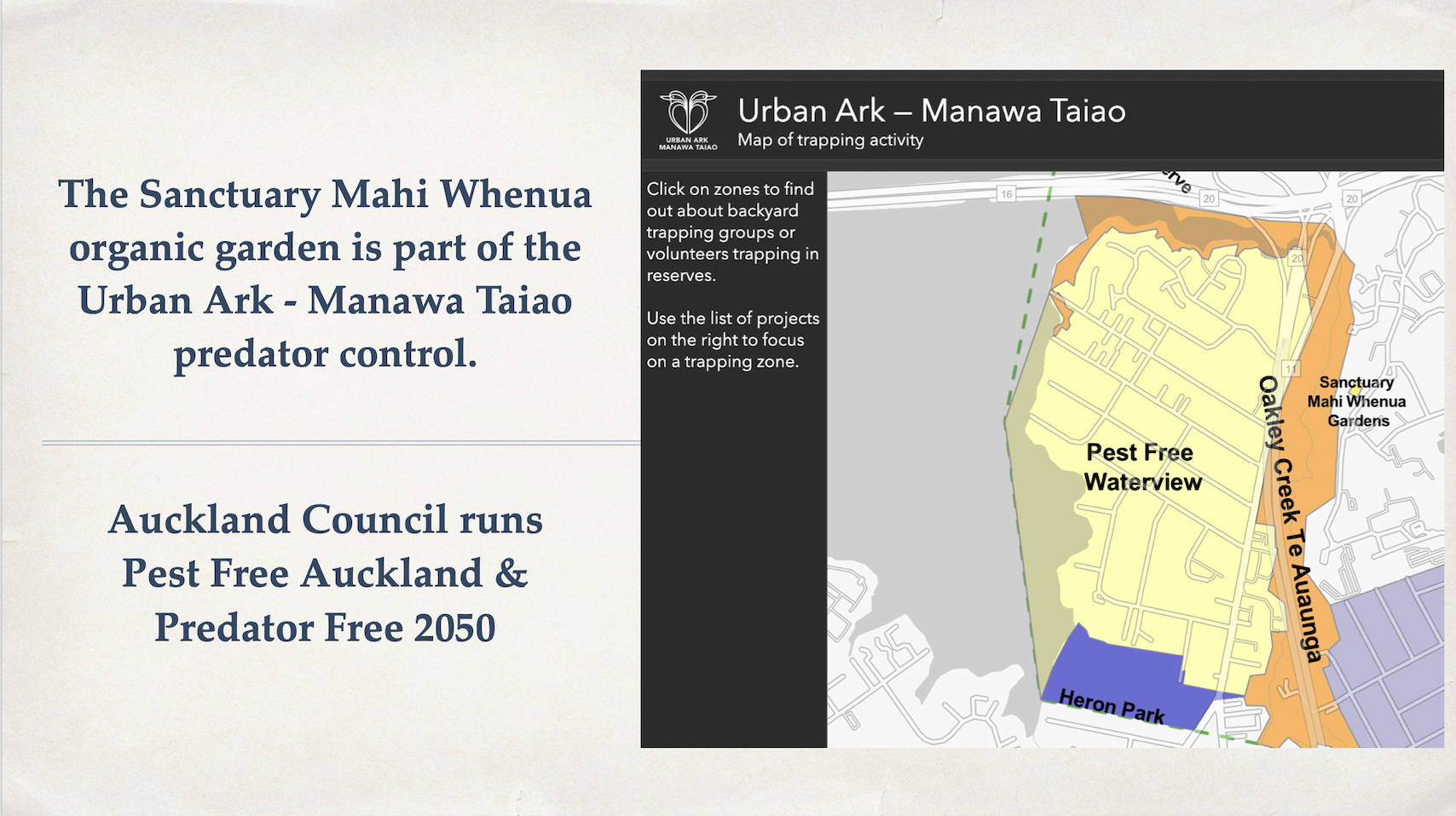 Slide 26 – The Sanctuary Mahi Whenua has worked with Urban Ark for many years and Jacqui Thompson-Fell directed me to Council’s PEST FREE AUCKLAND and PREDATOR FREE 2050 both of whom could assist with this concern.
