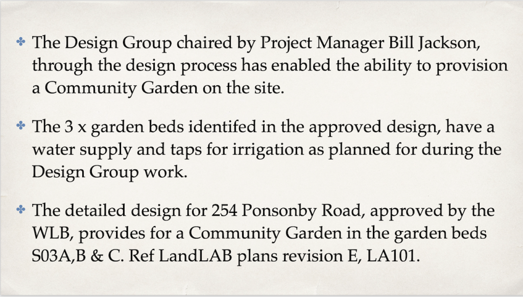 The detailed design for 254 Ponsonby Road, approved by the WLB, provides for a Community Garden in the garden beds S03A, B & C. Ref LandLAB plans revision E, LA101.