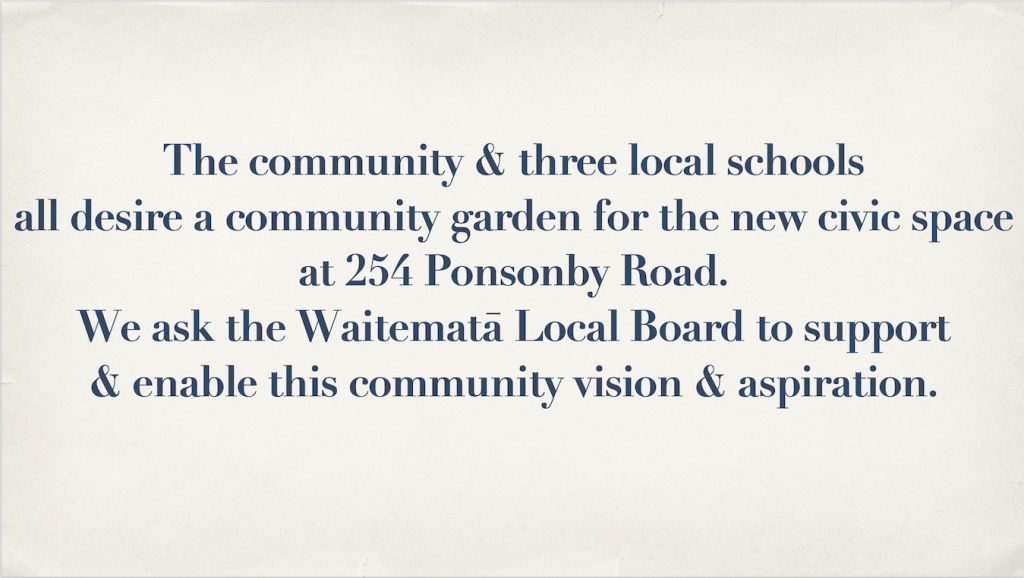 The Community-Led Design Group (CLDG) attended the Waitematā Local Board’s 18 June business meeting, presenting a deputation formally requesting support from the Board to enable the community aspiration of a community garden at the rear of the site at 254 Ponsonby Road.